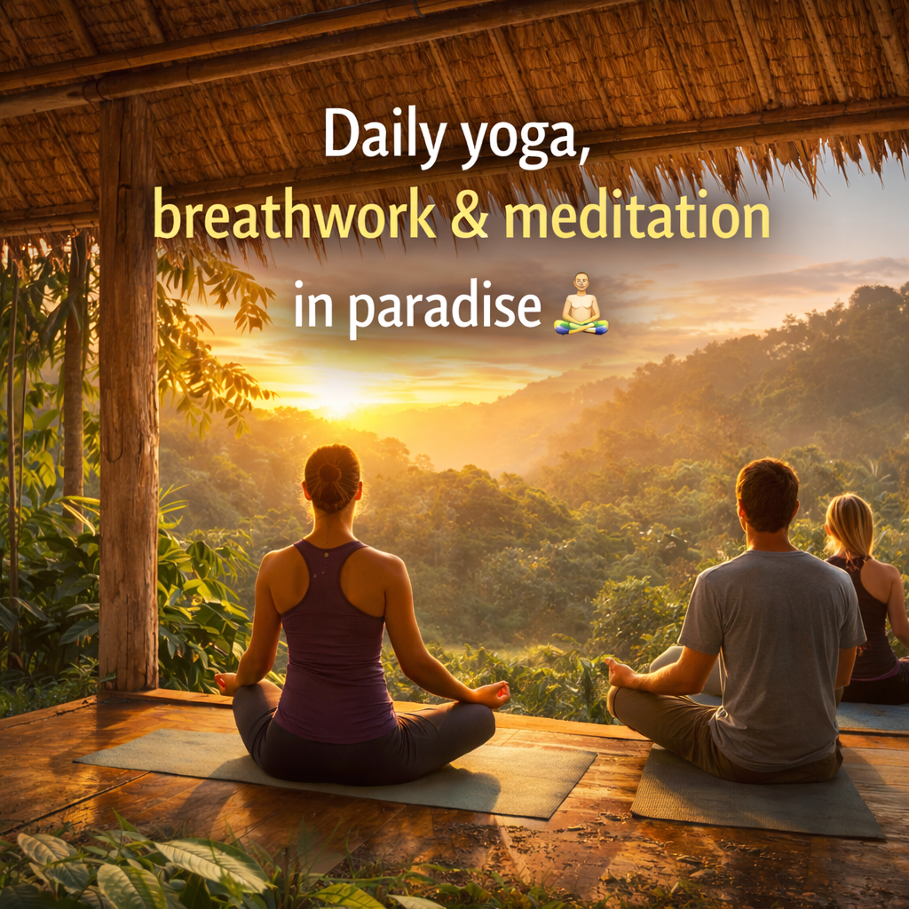 Evenings slow down with sunset yoga, grounding rituals, nourishing meals, and easy community connection under warm tropical skies.